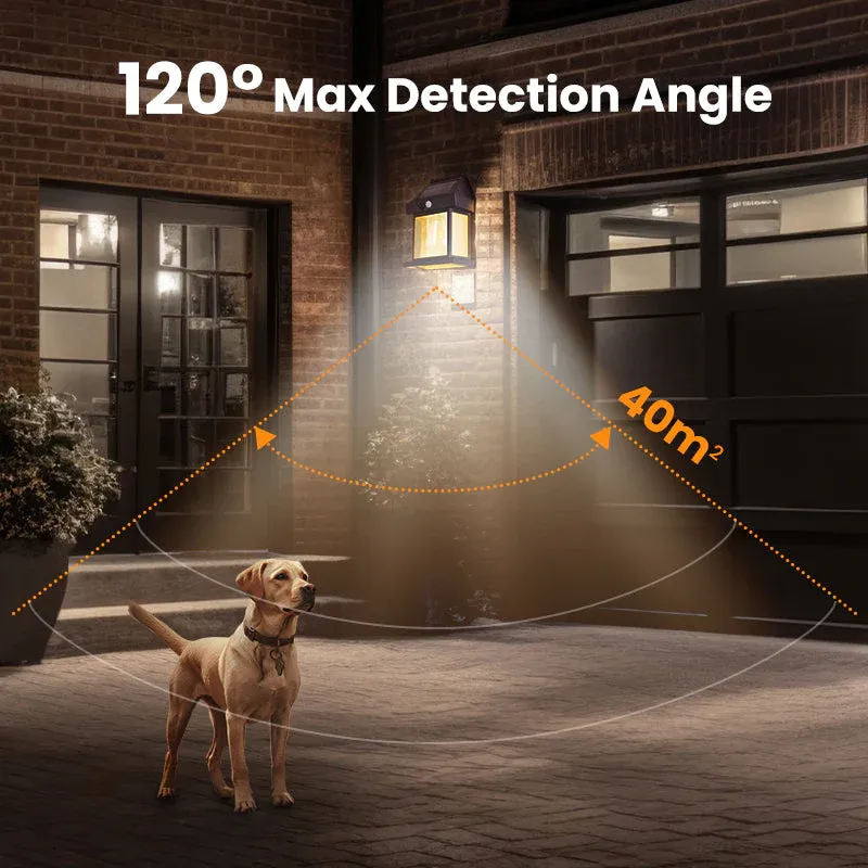 Smart Motion Sensor: The solar wall light has a built-in intelligent motion sensor that sensitively detects motion within a 120° angle within 8 meters.